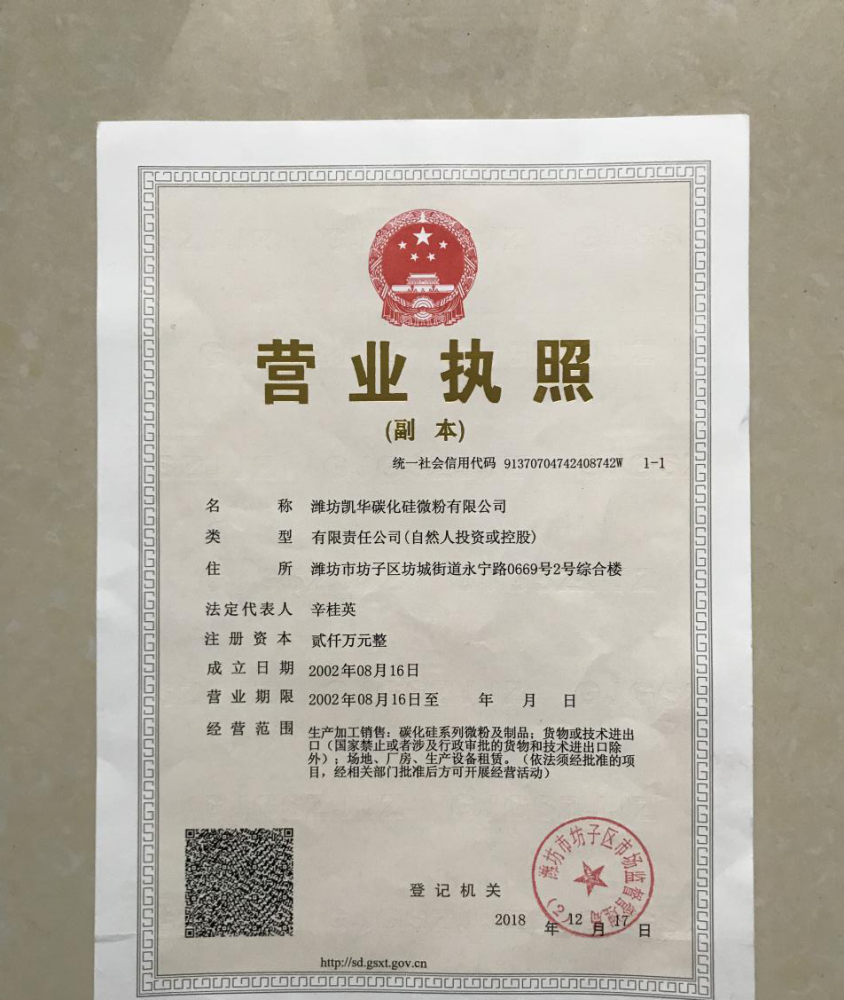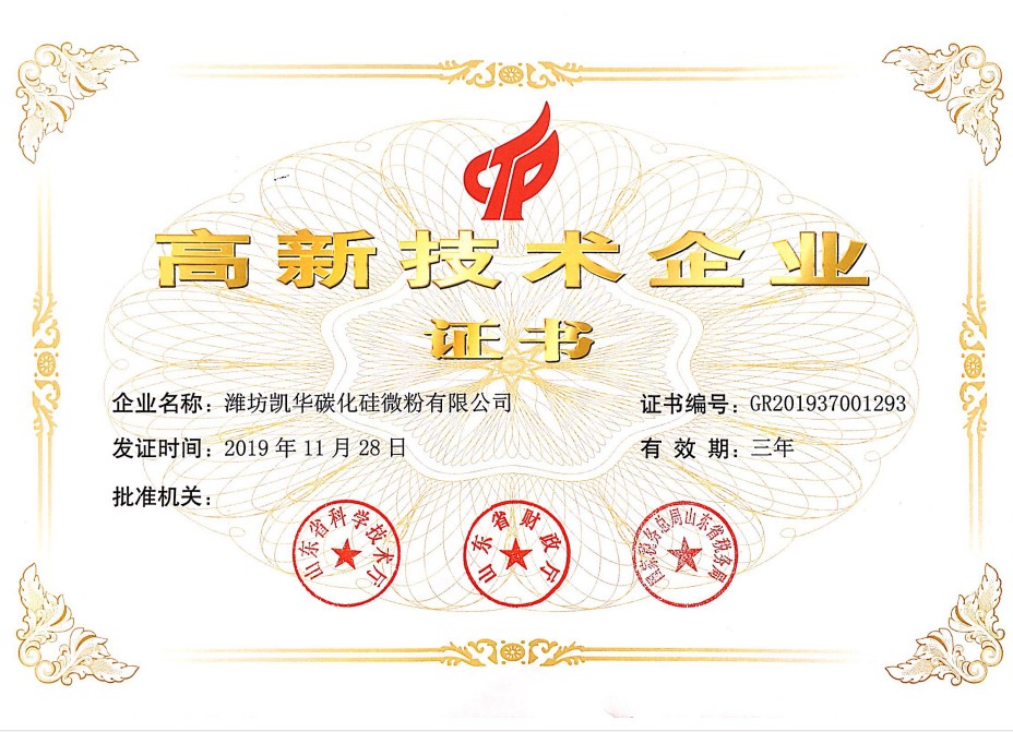 濰坊凱華碳化硅微粉有限公司成立于2002年,國家高新技術企業,公司占地40畝,標準廠房19000平方,辦公樓、研發處2000平方,年生產能力3萬噸。一直從事陶瓷級微粉的生產銷售,所生產的超細碳化硅微粉具有純度高、粒形好、穩定性強等特點,主要用于反應燒結、無壓燒結、硅碳棒新工藝、重結晶燒結、蜂窩陶瓷、機車制動裝置、研磨拋光、金屬防腐表面噴涂、納米隔熱保溫材料等領域。標準產品有:F240、F1200、W40、W28、W20、W14、W10、W7、W5、W3.5、 W2.5、W2、W1.5、W0.5、5S、D3E、100F、RS07、RS100及整形高密度系列綠碳化硅微粉......